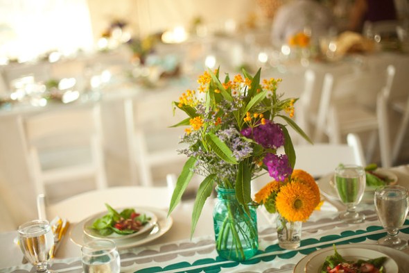 We wanted our wedding and reception to feel homey and intimate – kinda like a big ol’ dinner party! To achieve this, we opted for circular ceremony seating and a family-style meal at long banquet tables. Since we love to host suppers that last so long that folks retire to the living room, we created a mini lounge where we sat during dinner. We intentionally left several seats open in the lounge – including a cribbage bench – to encourage guests to come visit us. We spent a year and a half searching yard sales, antique stores, and Craigslist to collect the furniture we needed. Some call this crazy, but we call it weekend adventures!