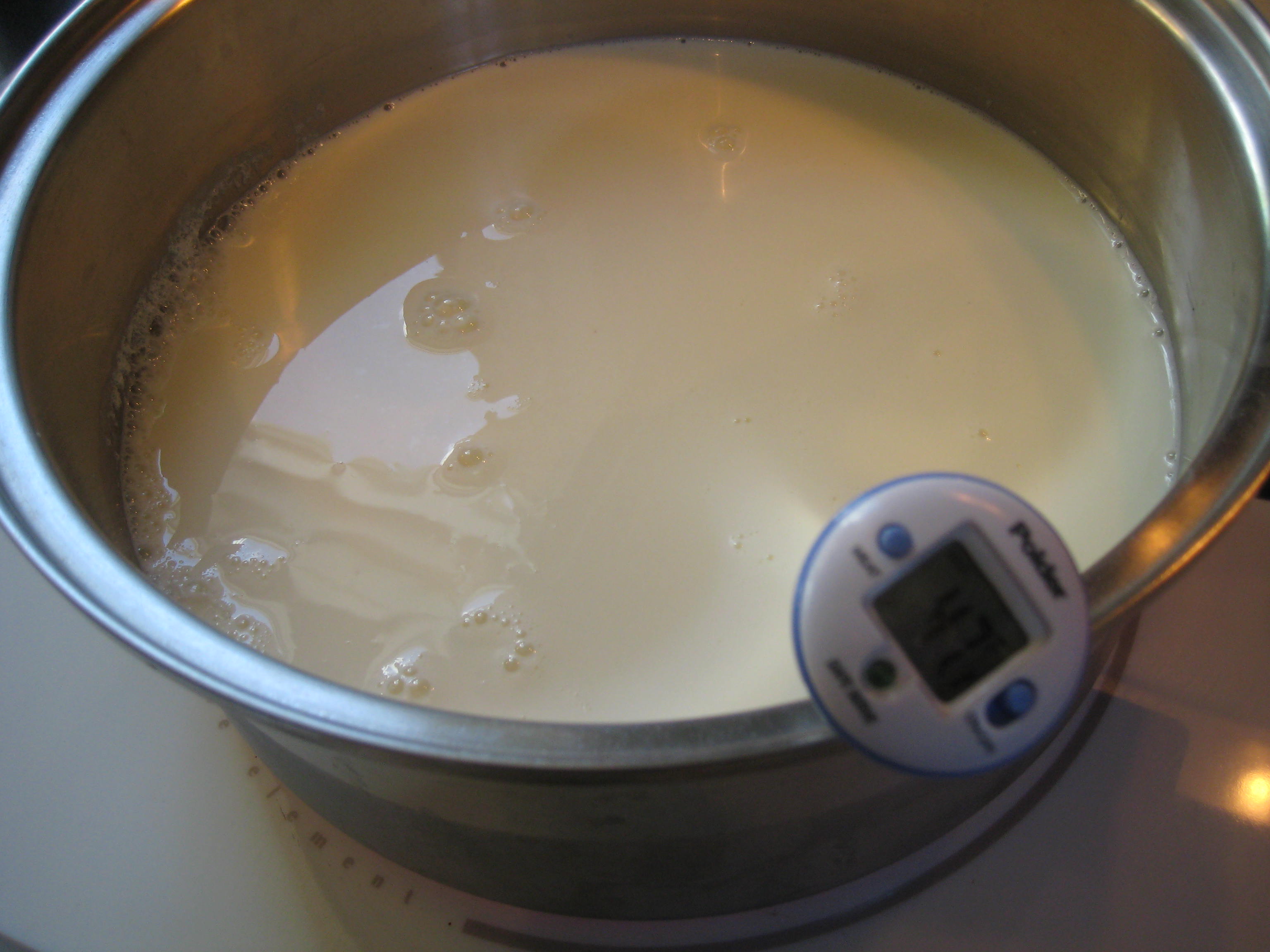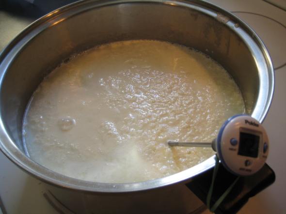 Add your milk and lemon juice to your iced pot and stir for 5 seconds without touching the bottom. Place the pot over low heat and attach the thermometer. Heat the milk to 175 degrees, which should take 40-50 minutes.