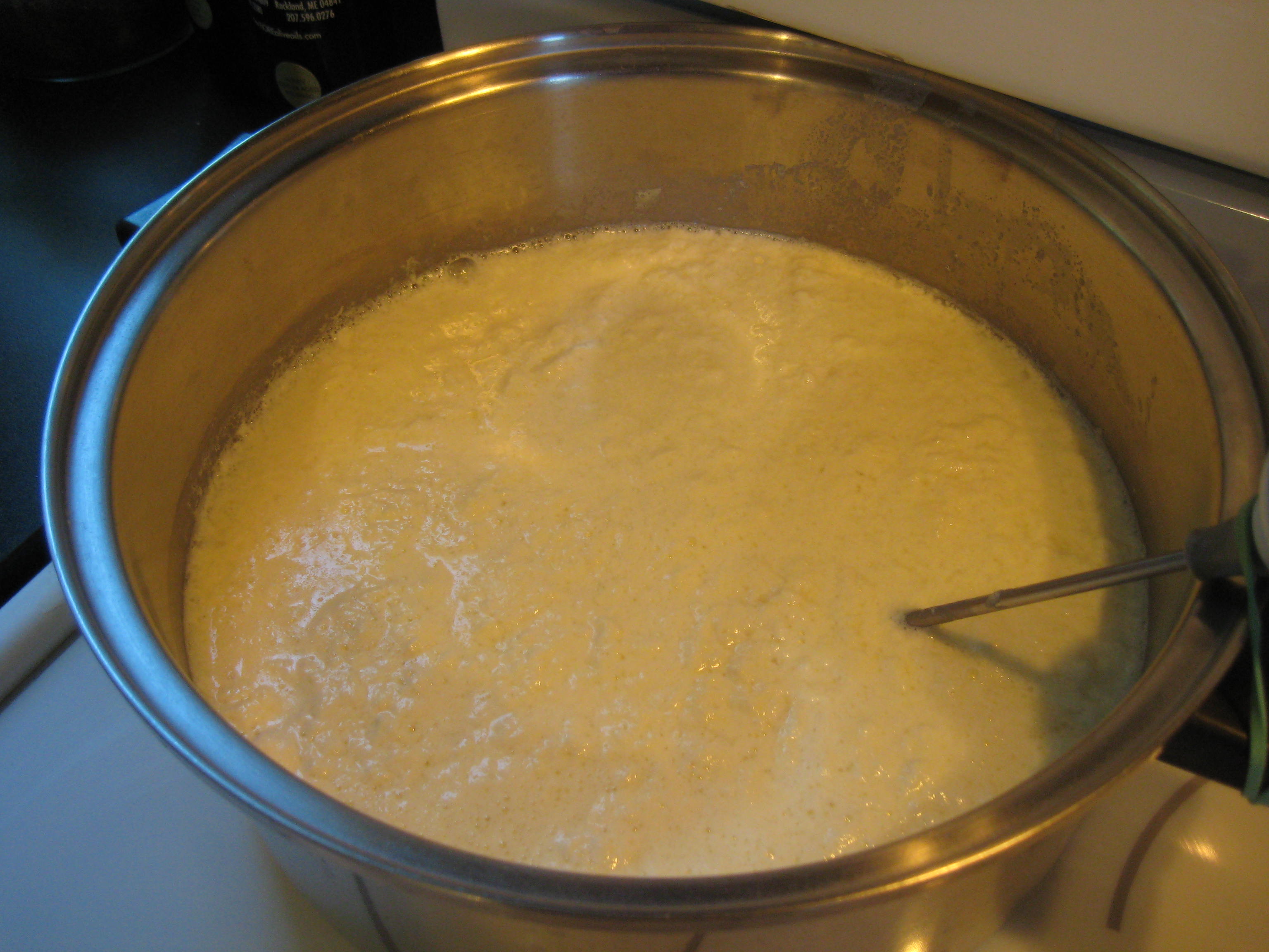 First things first, Alana offers a trick via “The Cheese Queen” (Ricki Carrol) to prevent scorching your pot. Simply place an ice cube in the bottom of your room temperature pot until it melts completely. Leave the water in the bottom of the pot when you add your ingredients and be sure to stir without touching the bottom. That keeps the bottom of your pot protected as your milk magically turns into cheese.