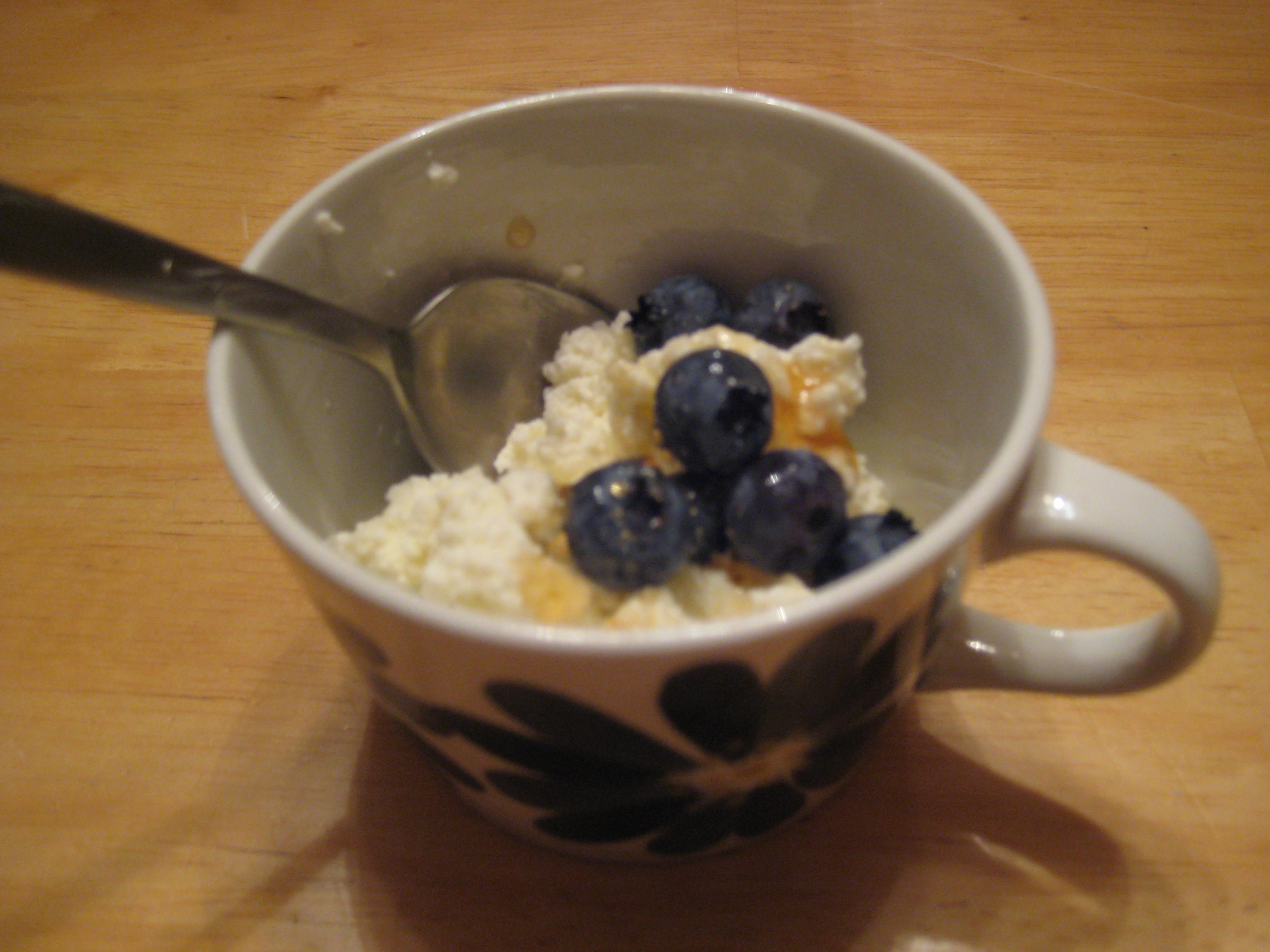 After some sampling, I declared this ricotta DELICIOUS! It has a really nice flavor that is somehow also very subtle. The texture perked right up after a few hours in the fridge. We served it topped with blueberries, some local honey, and a touch of cinnamon. Did I mention it was delicious?