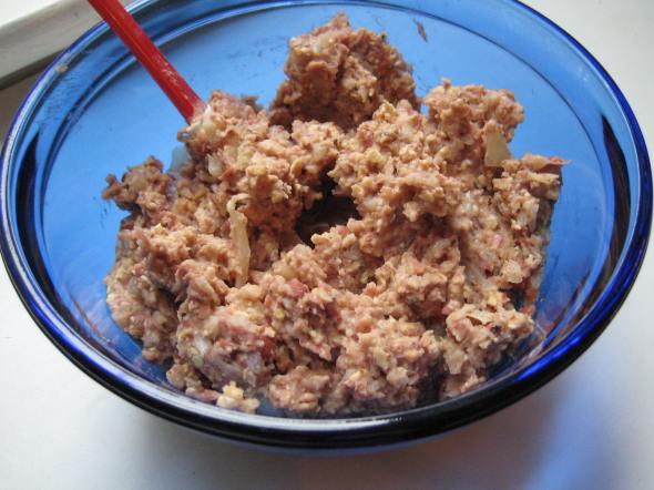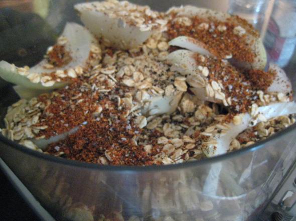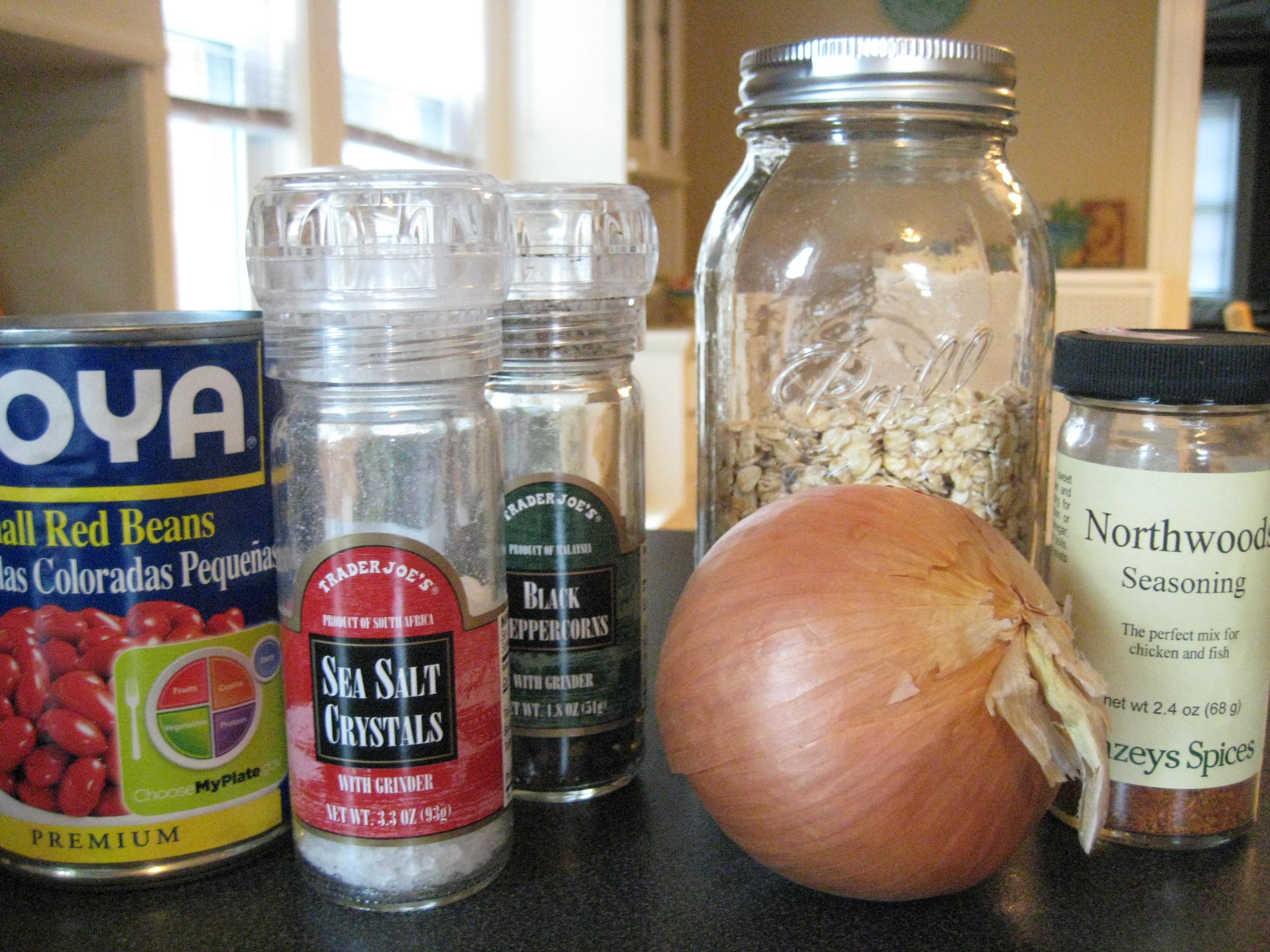 Combine the beans, onion, oats, seasoning, and S+P in the food processor and pulse until chunky but not puréed, adding a little liquid if necessary (this is unlikely but not impossible). It should produce a moist but not wet mixture. Let it rest for a few minutes if time allows.