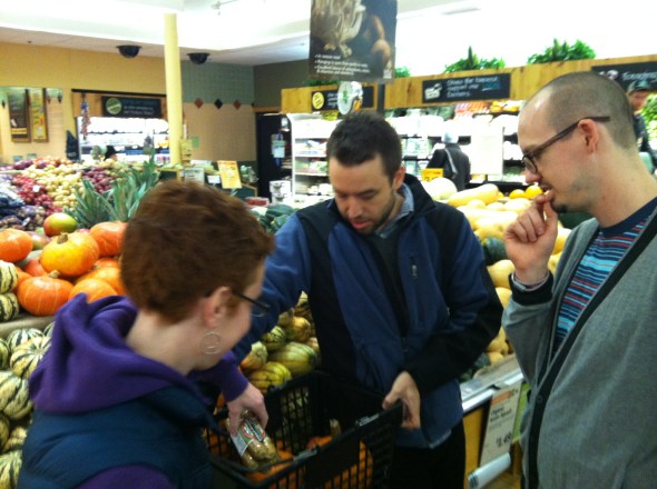 So, on Friday night, we drove out to Brighton to cook with our friends, Oliver & Will. Since we hadn’t menu-planned, I had this wacky idea that we should wing it, food competition style. I suggested that we head to the grocery store – split up – and each return with one ingredient. We would then caucus, choose a menu, and and add a few more ingredients. Oliver and Will immediately said – like a Mystery Box! (I confess I’m not a MasterChef watcher, but I got the gist.) SO FUN, right?! Right. Here’s how it went down.