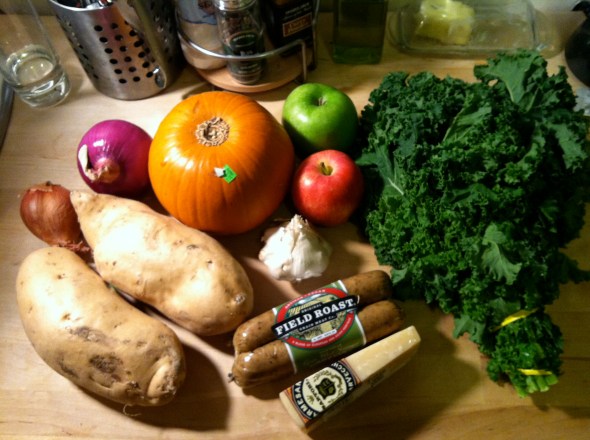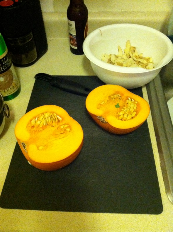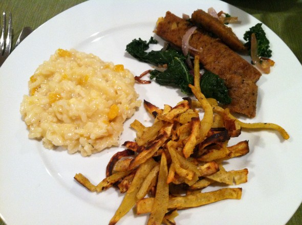 …and ultimately decided on a menu of pumpkin risotto, yam fries, and sausage on a bed of kale. For dessert? Some vanilla ice cream and sautéed apples with candied pepitas (pumpkin seeds). OH YEAH!