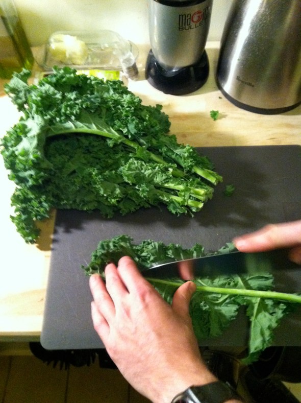 While tending the risotto, Oliver also diced the onion and garlic for the kale. (That boy worked hard!)