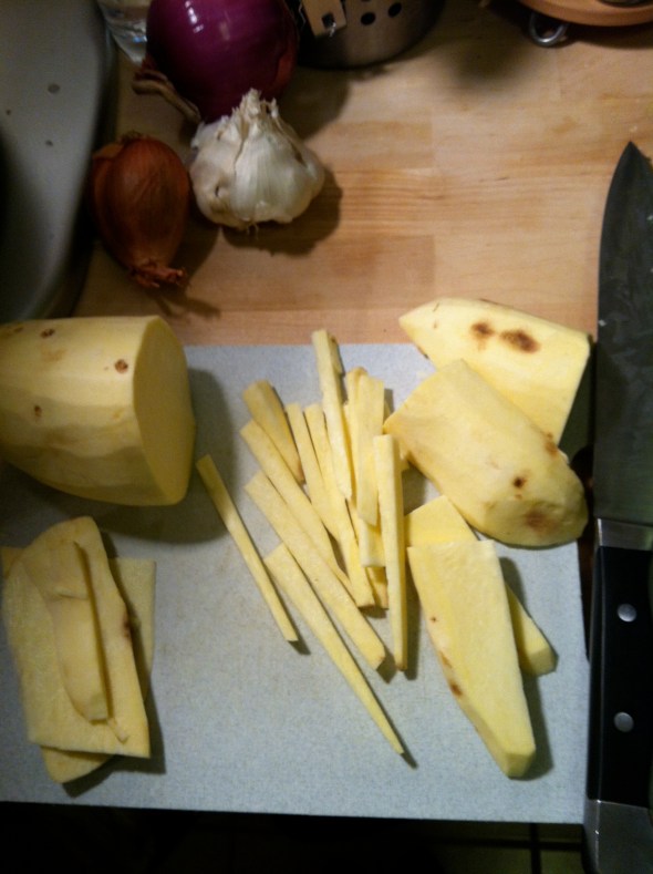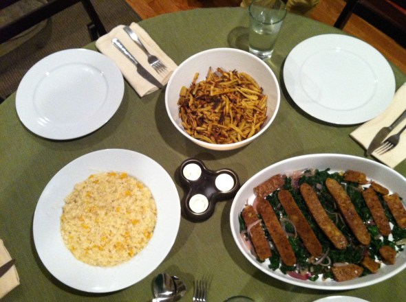 Then Will cooked up the kale and sausage while I seasoned the yam fries with salt, pepper, curry powder, and a smidge of cinnamon – and got them in the oven.