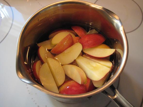 Place the apples in a small pot and add enough water to almost cover them; bring to boil, then add ginger, cover and reduce heat to medium-low