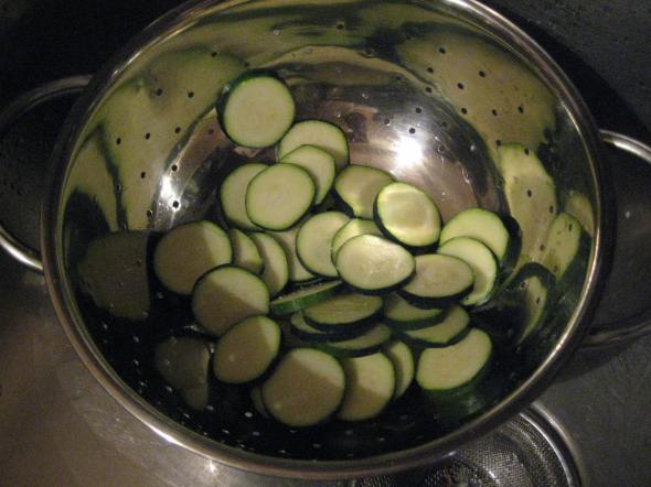 Let it “sweat” in a colander for about 20 minutes. (This suggestion came from somewhere on the internets. I’m not sure of the purpose. I know that often people salt eggplant to remove the bitterness, but zucchini isn’t particularly bitter. You could probably skip this step, but if so, you may want to salt the dish somewhere else in the recipe.)
