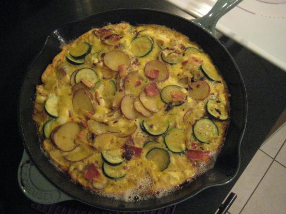Add the potatoes and onions, zucchini, bacon, and about a cup of cheese (I went with feta) to the egg mixture.