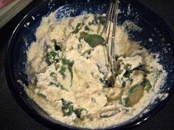 - While the sausage is cooking, combine the ricotta, eggs, salt, pepper, nutmeg, and spinach in a bowl and thoroughly combine