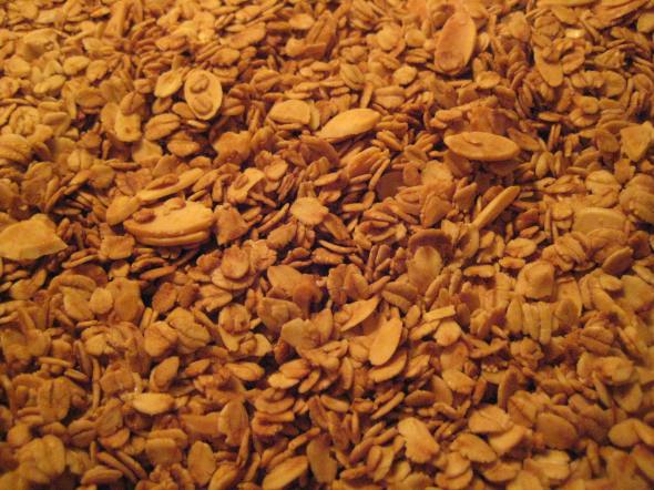 2. In a large bowl, combine the oats, almonds, and salt.