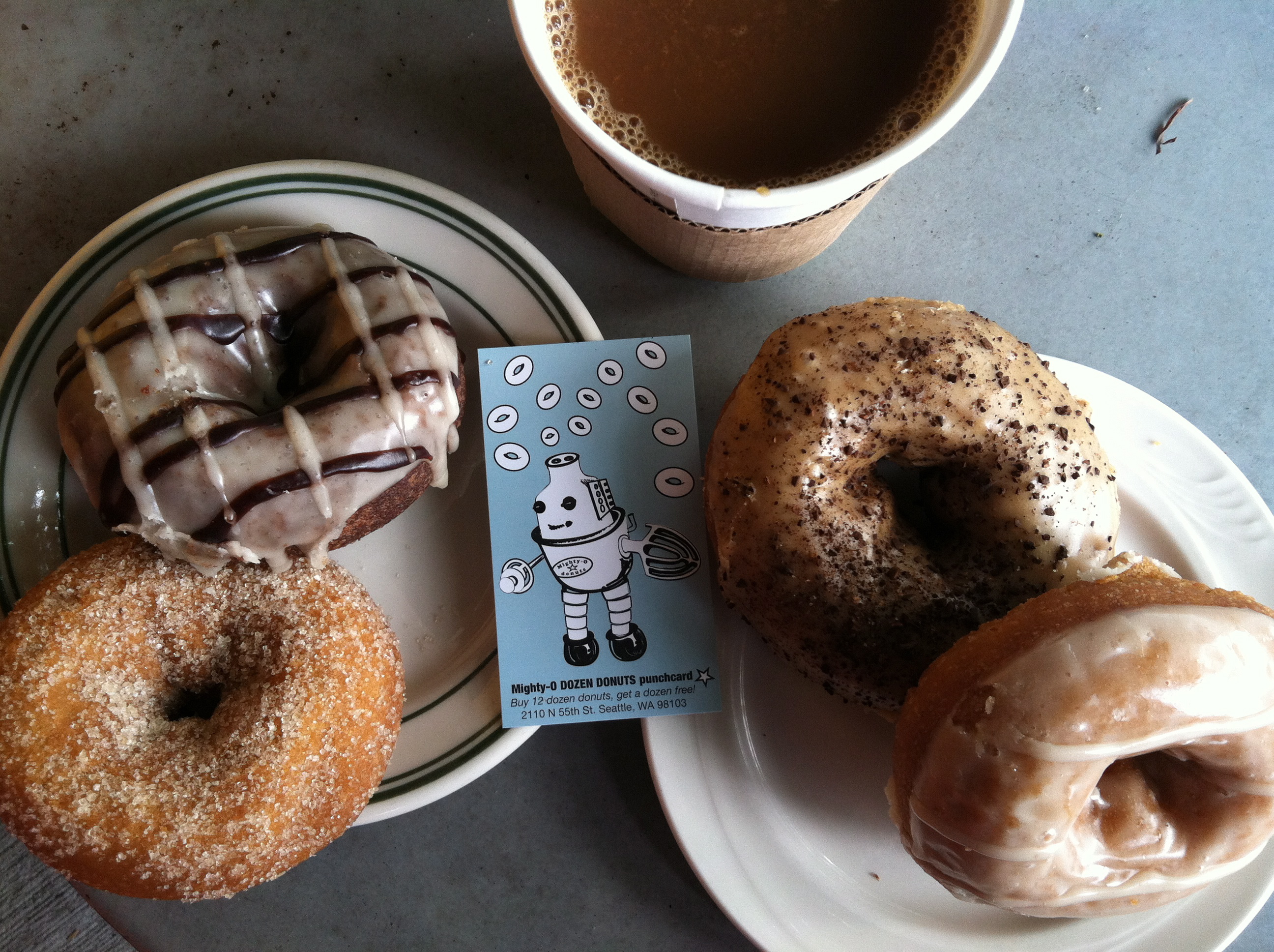 Cinnamon Sugar, Grasshopper (Chocolate + Mint), Coffee Bomb, and Original Glazed. Not pictured: Blueberry Monster and Original with Sprinkles